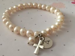 Natural Pearl bracelet with cross, pearl dangle & handstamped sterling silver letter charm